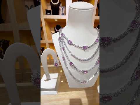 طقم زفاف باللون الوردي النابض بالحياة يتميز بألماس المحاكى عالي الجودة، مثالي لإطلالة عروس أنيقة وساحرة.
