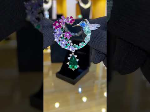دبوس زهرة حديقة أمنية بتصميم زهور متعدد الألوان وأحجار خضراء على شكل دمعة من الفضة عيار 92.5