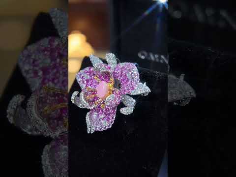 تتزين هذه القطعة بأحجار ألماس صناعية عالية الجودة باللونين البنفسجي والأبيض، حيث تم صقل كل حجر بدقة متناهية ليمنح بريقًا ونقاءً استثنائيين، ولمعانًا متألقًا يشبه بريق الألماس. يبرز المزيج المتناغم بين اللون البنفسجي النابض بالحياة والأحجار البيضاء الكلاسيكية التصميم الزهري، مما يخلق تباينًا آسرًا يلتقط الضوء بجمالٍ أخاذ.