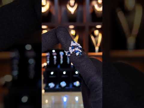 - Gemstones: Premium Blue and White Simulated Diamonds in Marquise and Pear-cut configurations.