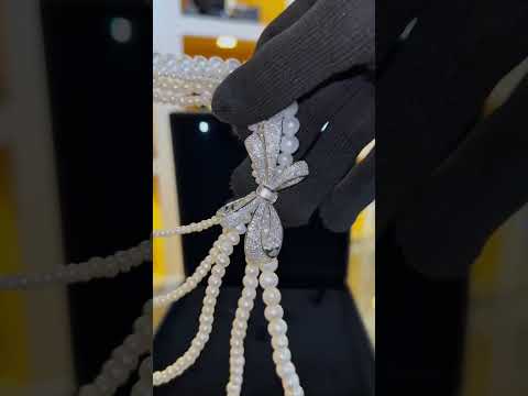 Omnia Almas Bow Fresh Water Pearl Long Chain Necklace with High Quality Simulated Diamonds