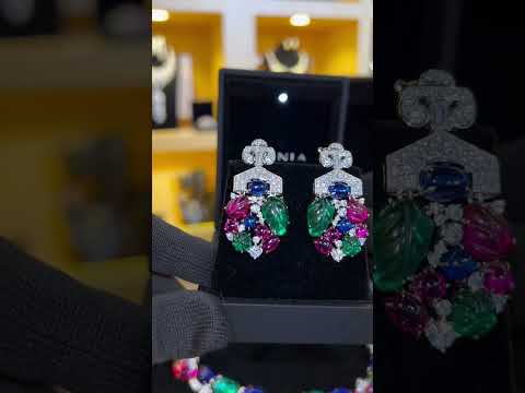 Omnia Bhakita Drop Earrings with Multicolor Leaf Design and Simulated Diamonds in 92.5 Silver