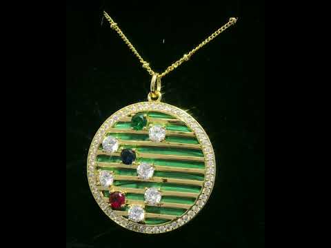 Omnia Celestia Malachite Round Pendant Necklace with Multi-Color Zircon Accents in Brass with Gold Plated Finish