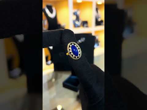 Omnia Layal Vintage Oval Lapis Statement Ring with Geometric Detailing in Brass with Gold Plated Finish